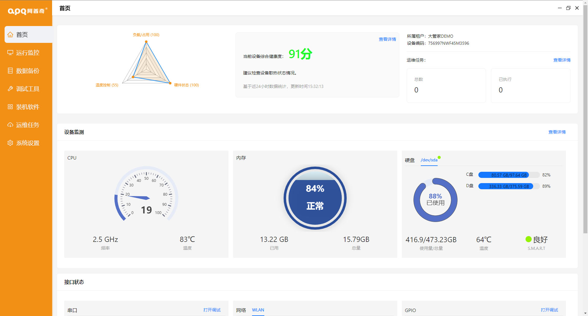| 支持對IPC硬件狀態(tài)進行監(jiān)測,支持本地存儲。 | 從IPC多維度動態(tài)計算健康評分,精準(zhǔn)定位潛在故障點 | 支持創(chuàng)建備份任務(wù),支持配置任務(wù)名稱,備份源位置、鏡像存放位置 | 具備串口及GPIO調(diào)試工具 | 搭配IPC大管家,能夠?qū)⒃O(shè)備監(jiān)測數(shù)據(jù)及異常事件上傳到IPC大管家 |