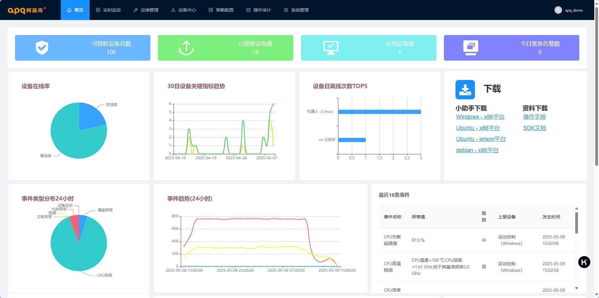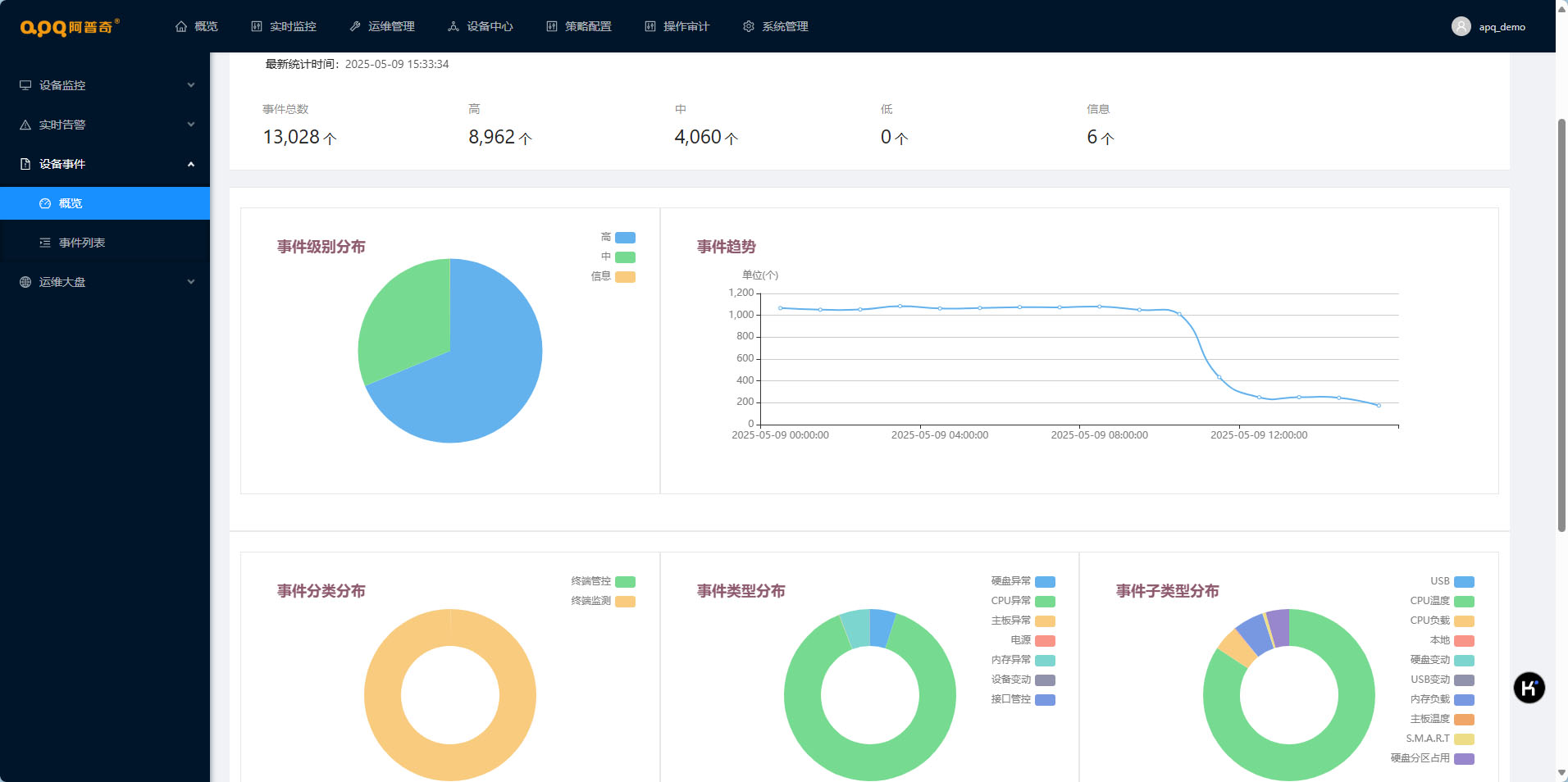 系統具有全面的檢測策略配置,包括:CPU負載超過閾值、CPU溫度超過閾值、內存占用超過閾值、磁盤空間不足、磁盤S.M.A.R.T.異常、網絡異常、主板溫度、軟件啟動等事件。
