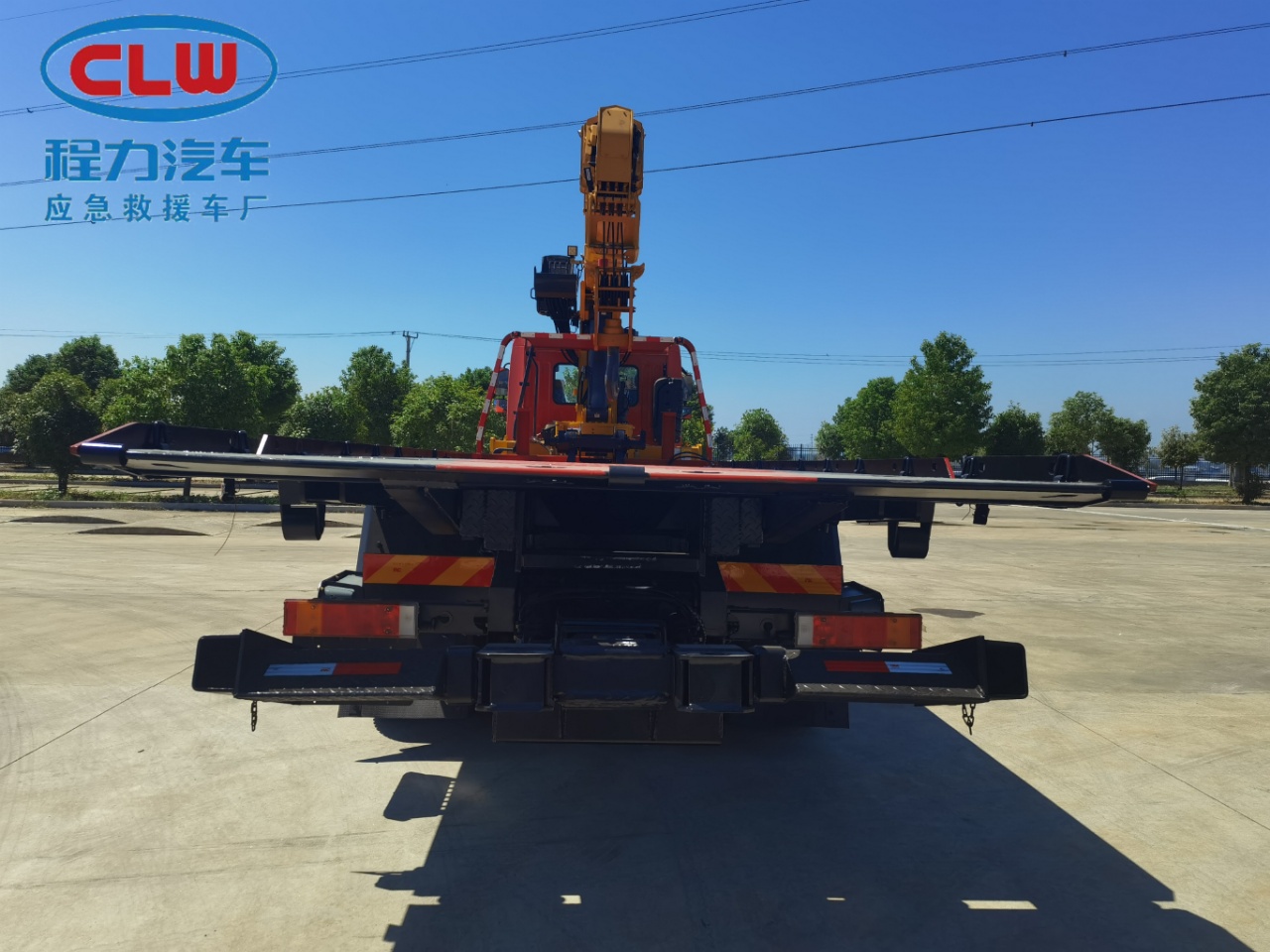 一拖二上裝配置:雙側(cè)聯(lián)動操作裝置,6個厚的花紋板,雙油缸,13噸平板,13噸3節(jié)后拖臂,10噸絞盤(35米鋼絲繩),4根綁帶,L型抱胎架一對,抱胎筒一對,小車1對,3對拖叉,1對鋼板吊耳拖叉,1對拖叉座。板長8.6米,寬2.55米